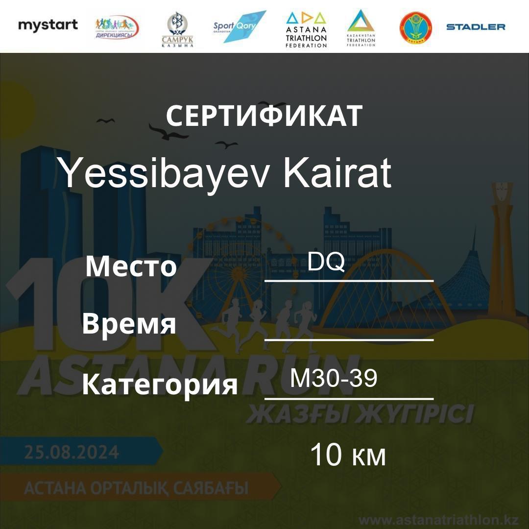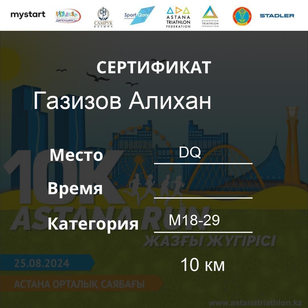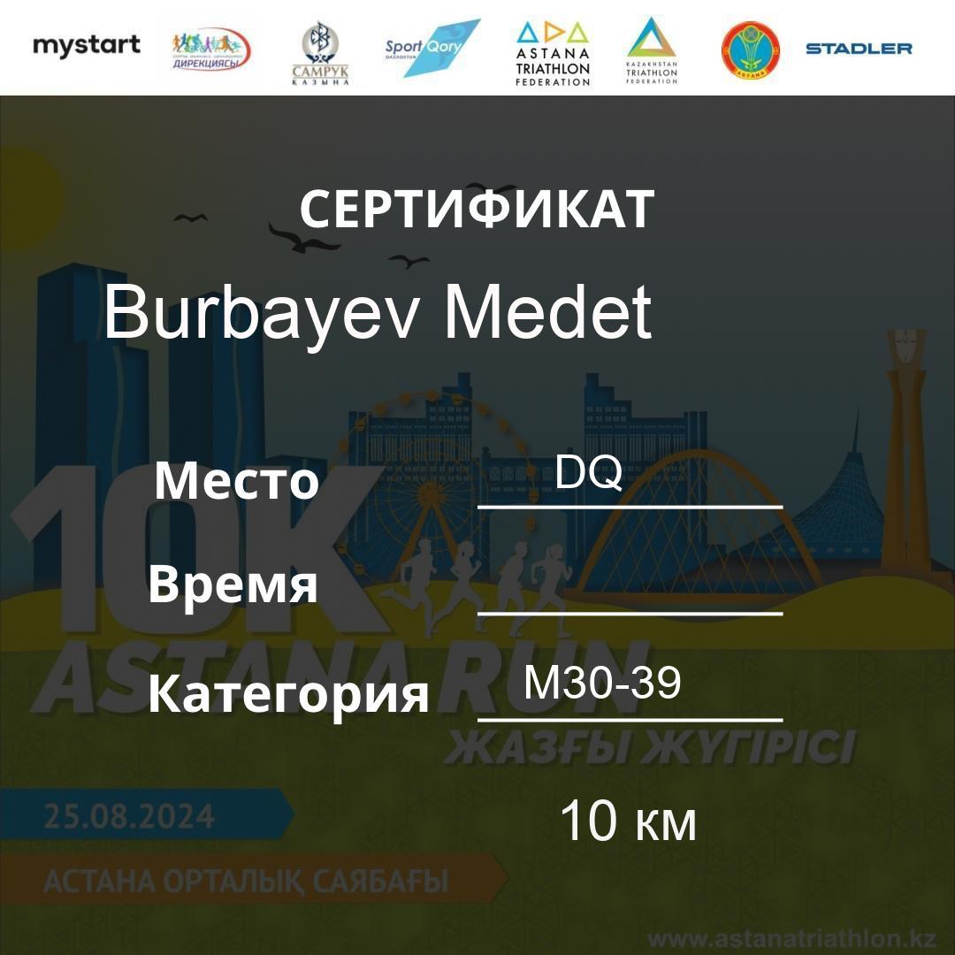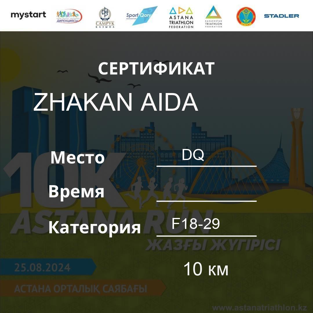 | DQ | Usserbayeva Aizhan | 626 | F30-39 | 10 км | Download | ||