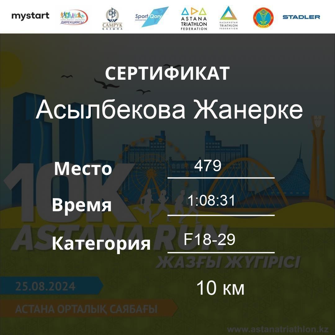 | 479 | Асылбекова Жанерке | 478 | F18-29 | 10 км | 1:08:31 | 23 | Download |