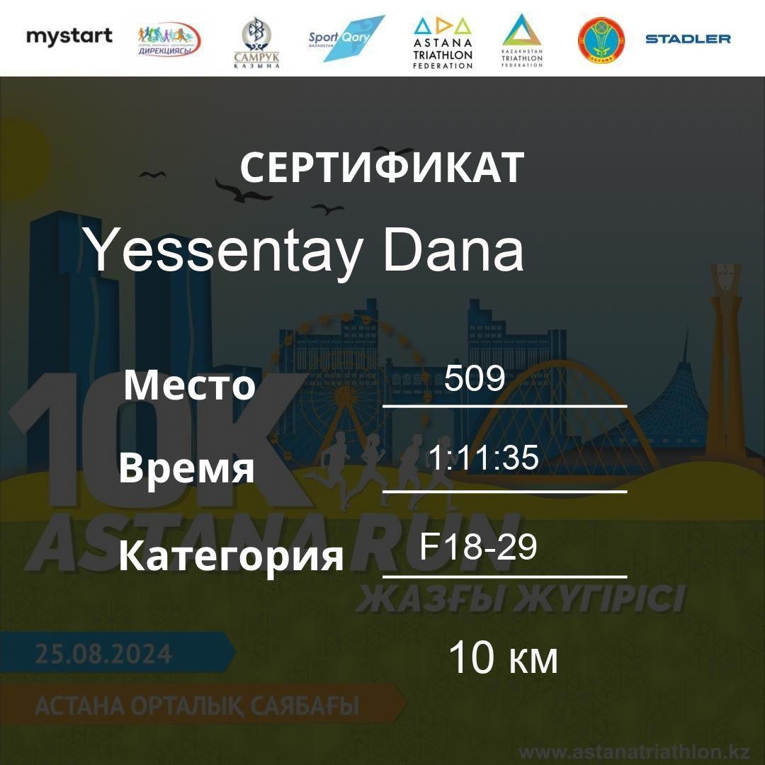 | 509 | Yessentay Dana | 435 | F18-29 | 10 км | 1:11:35 | 25 | Download |