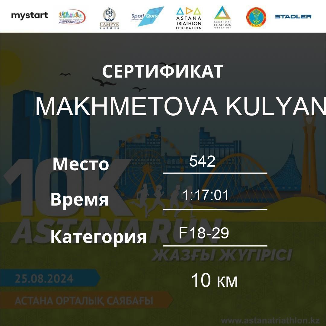 | DNS | Bektemirova Gulmira | 87 | F30-39 | 10 км | Download | ||