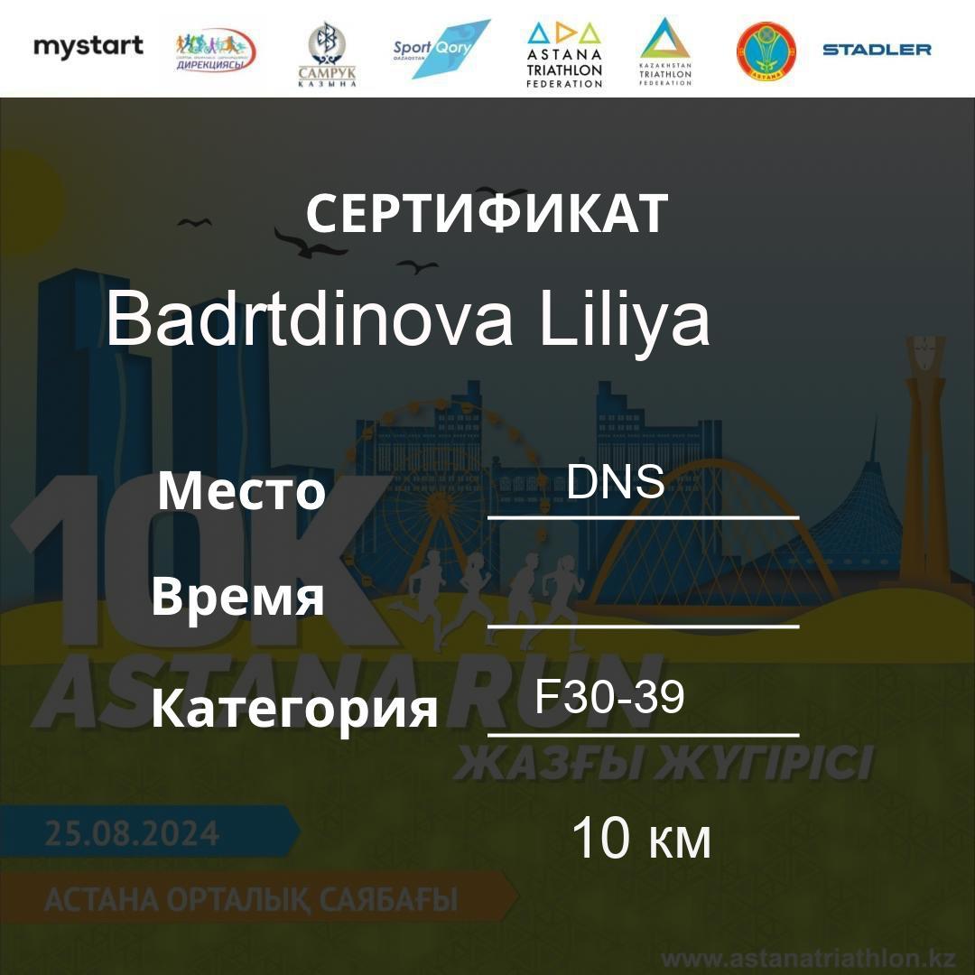 | DNS | Badrtdinova Liliya | 56 | F30-39 | 10 км | Download | ||