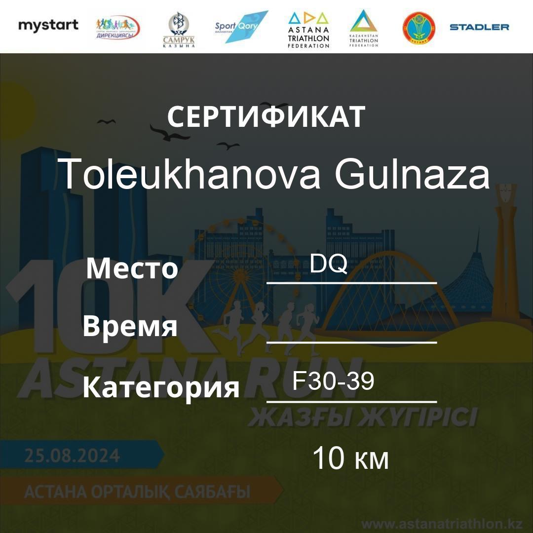 | DQ | Toleukhanova Gulnaza | 618 | F30-39 | 10 км | Download | ||