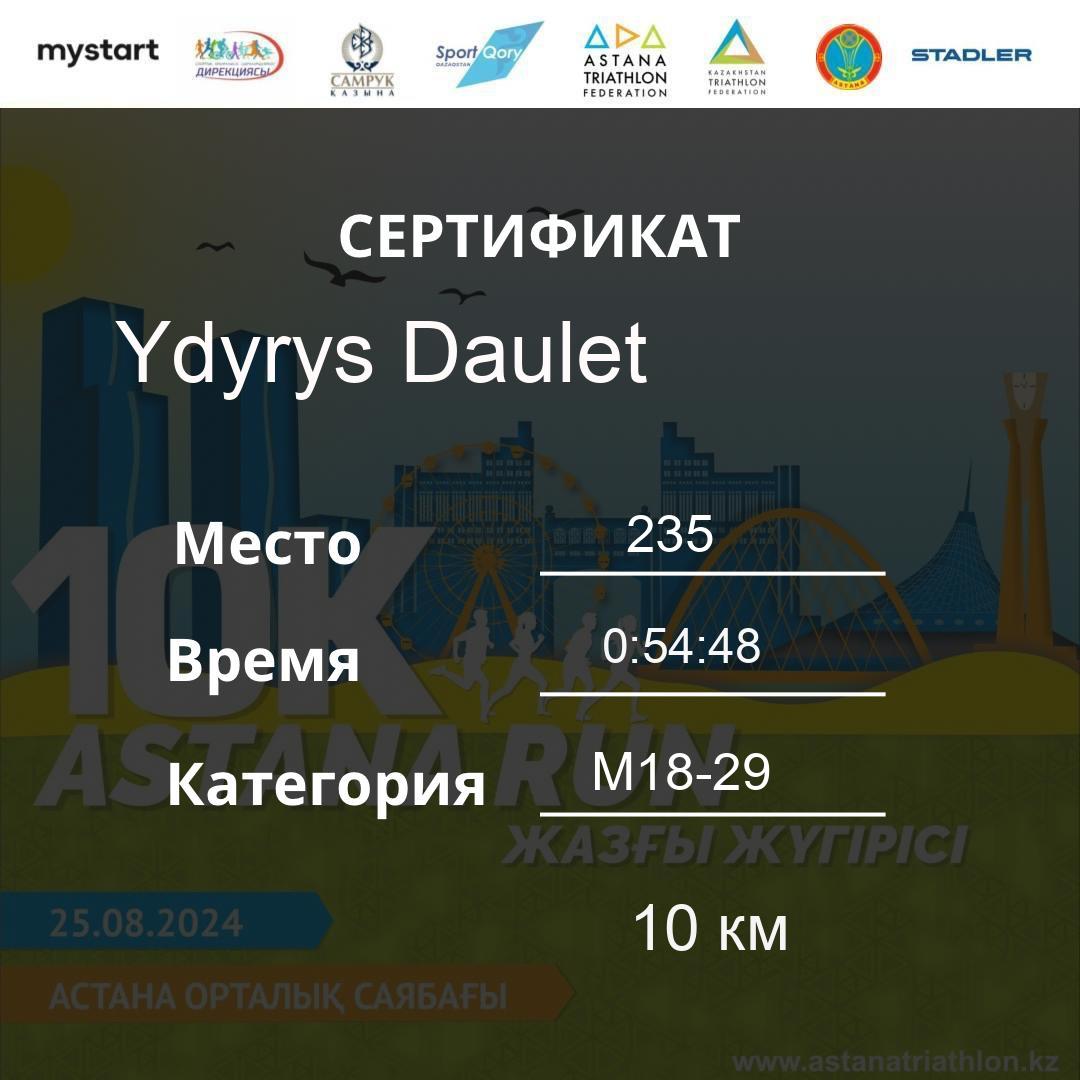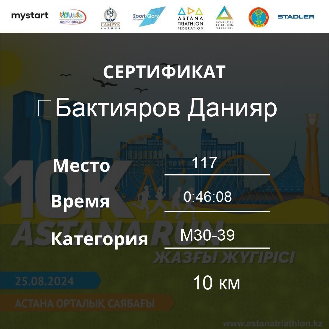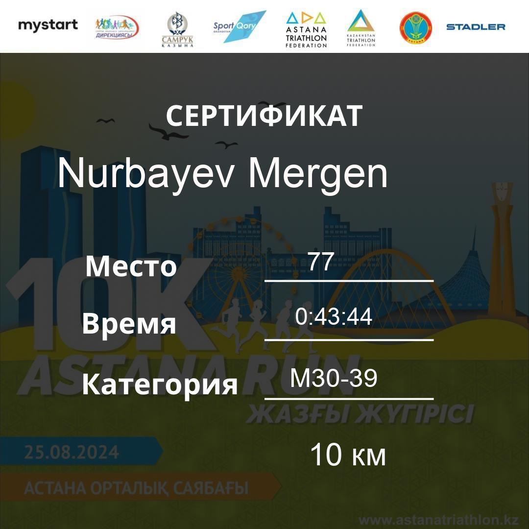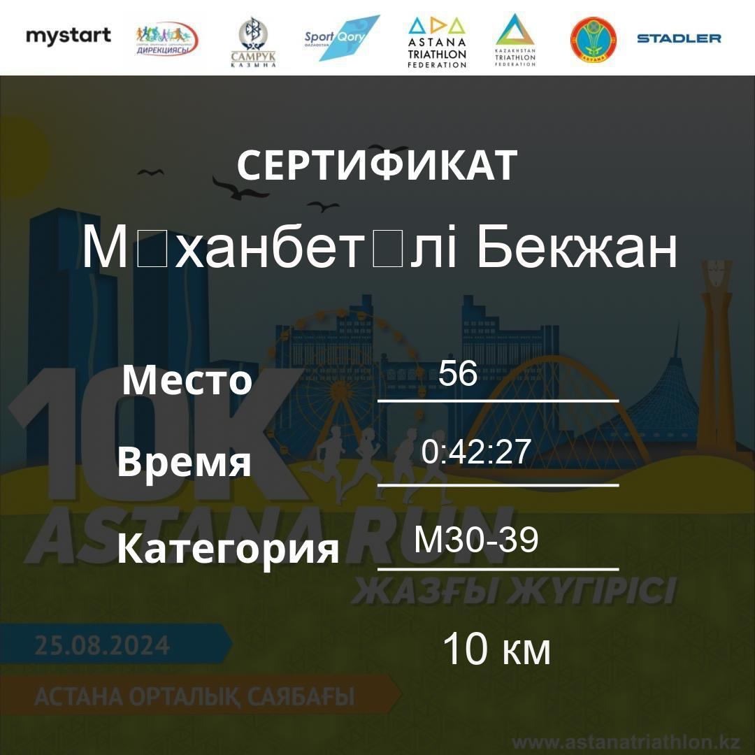 | 478 | Meldebekov Nariman | 251 | M40-49 | 10 км | 1:08:20 | 91 | Download |