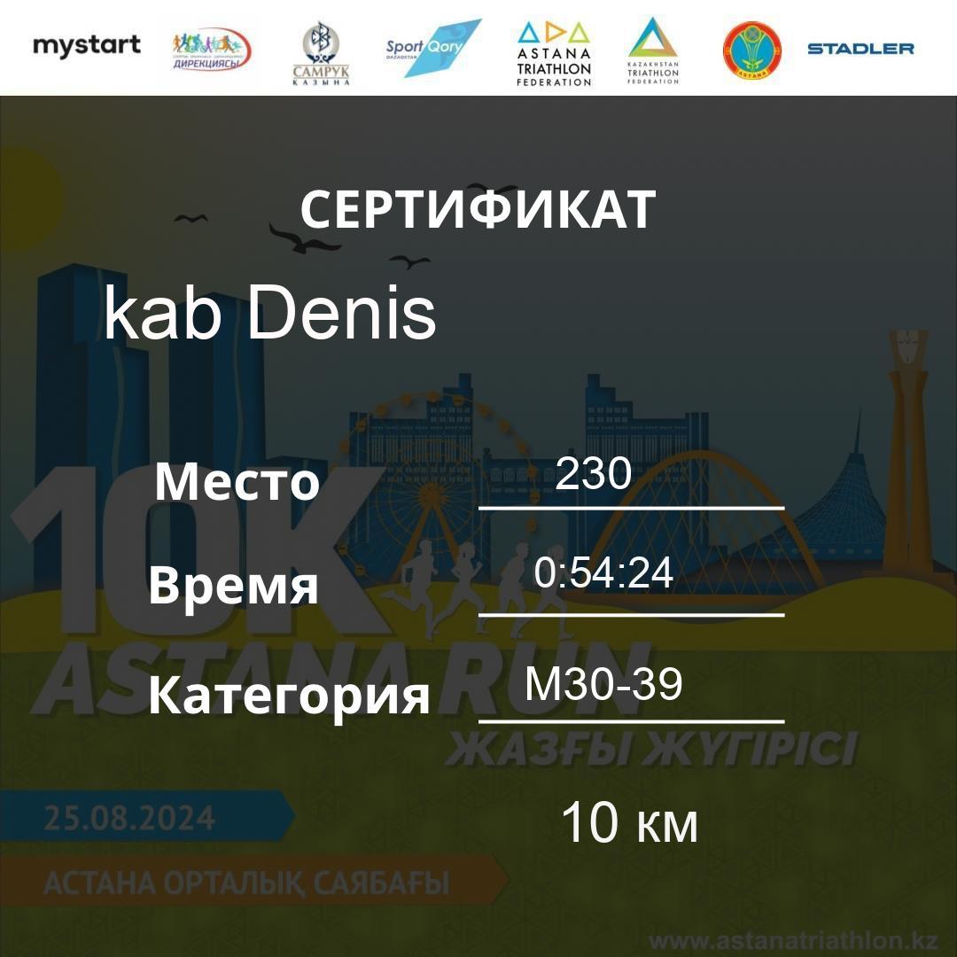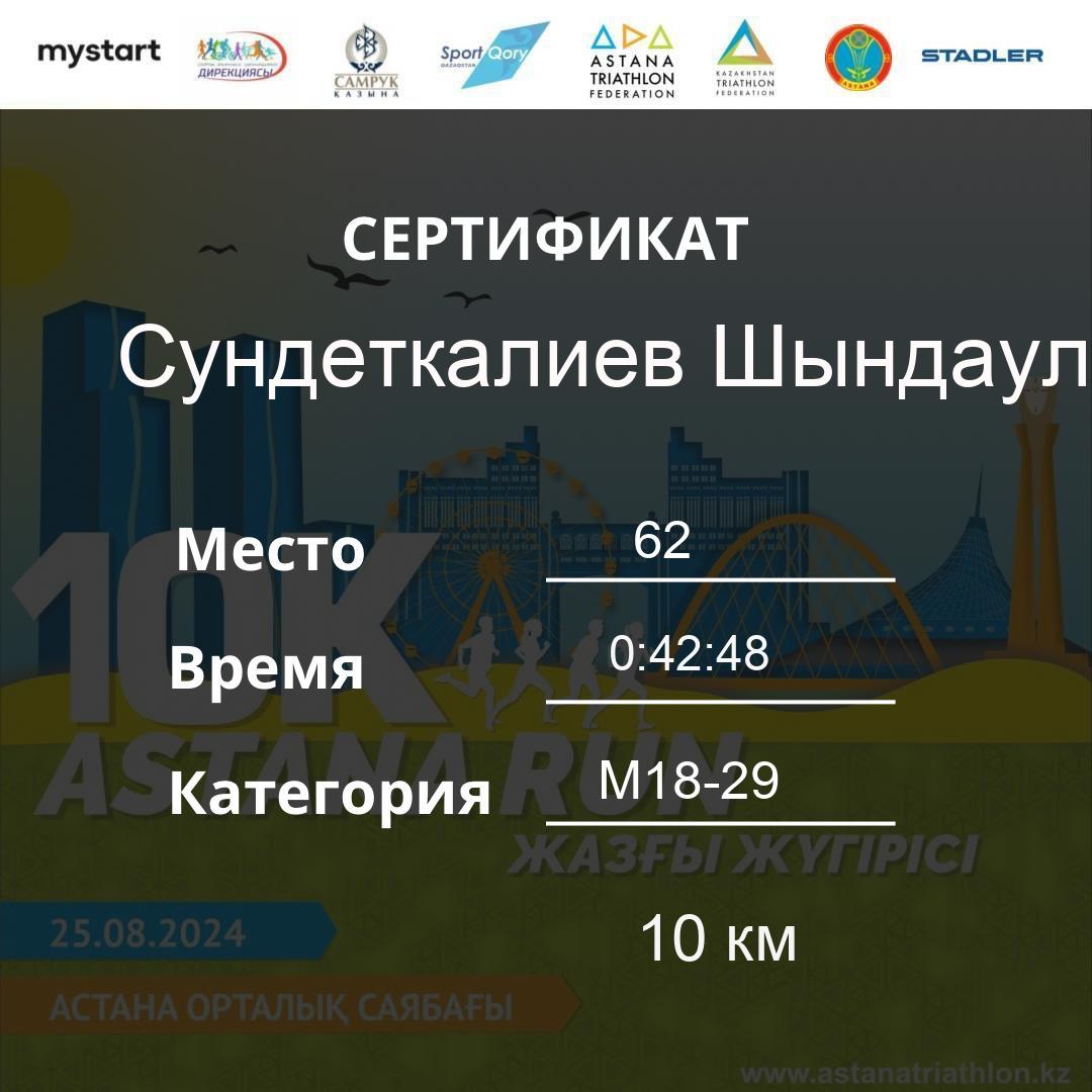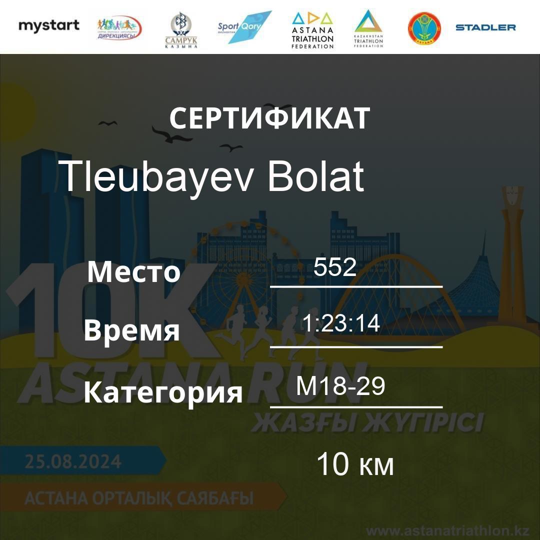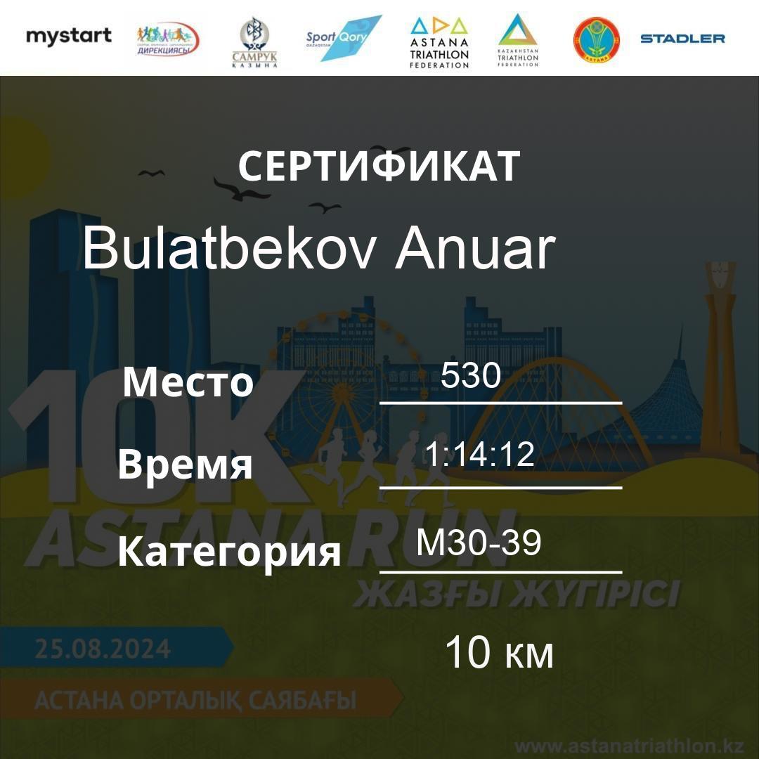 | 478 | Meldebekov Nariman | 251 | M40-49 | 10 км | 1:08:20 | 91 | Download |