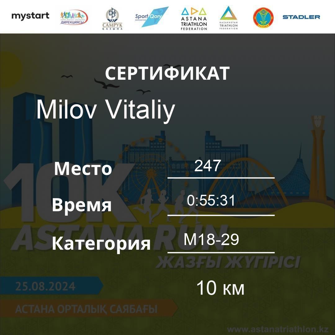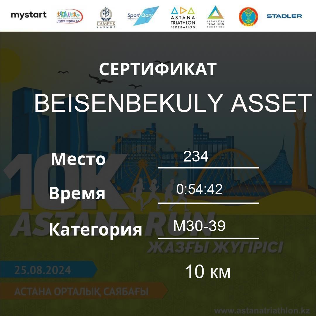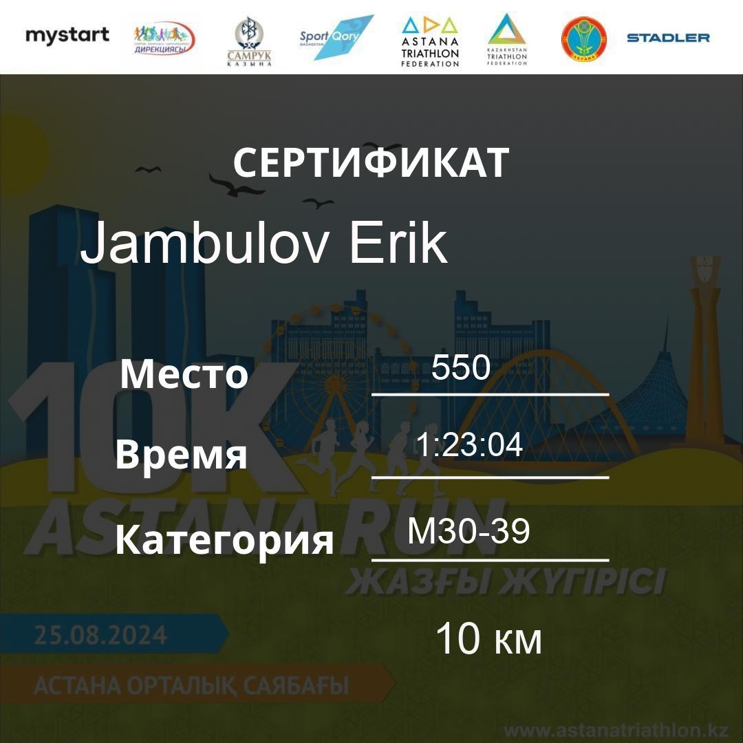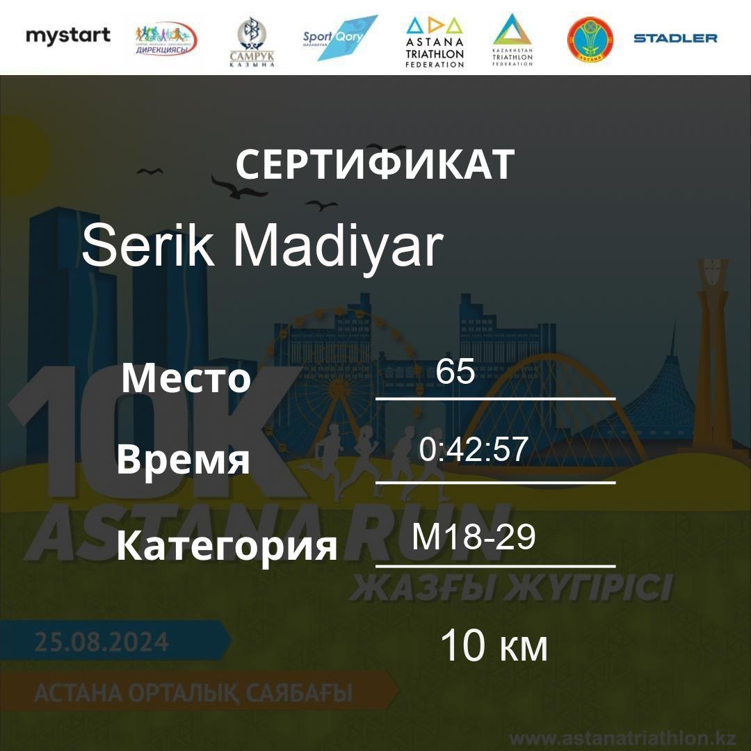 | 478 | Meldebekov Nariman | 251 | M40-49 | 10 км | 1:08:20 | 91 | Download |