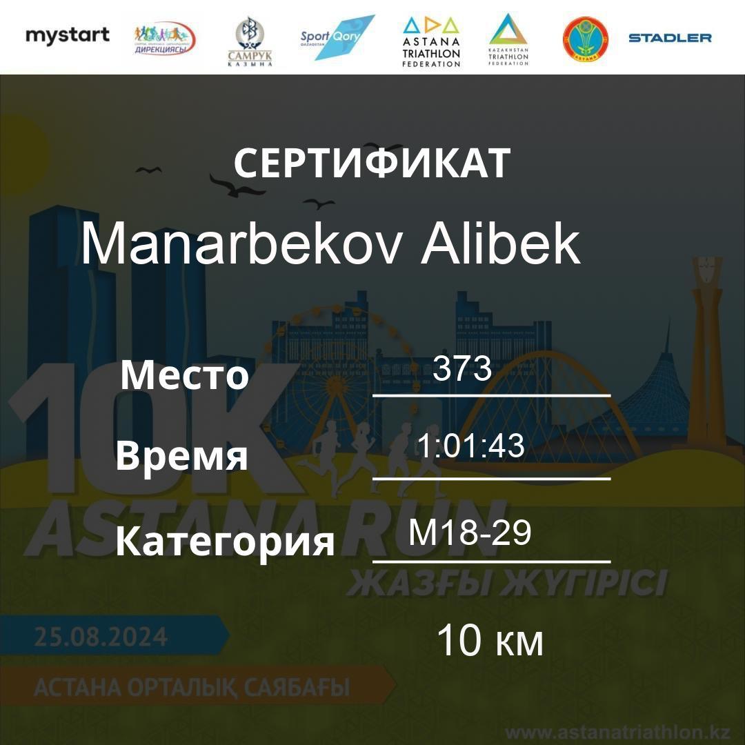 | 482 | Sembinov Almas | 335 | M40-49 | 10 км | 1:08:45 | 92 | Download |