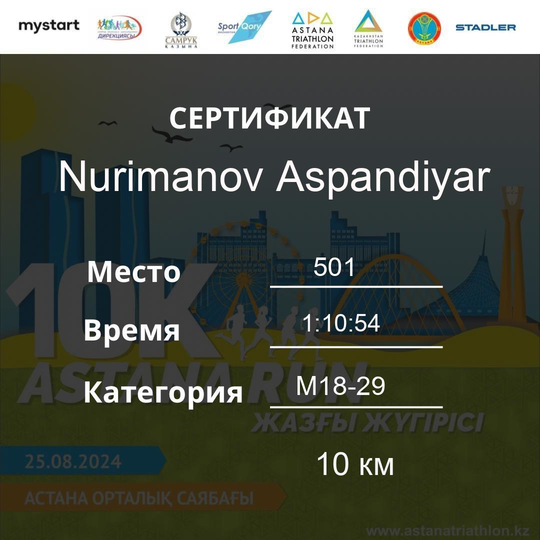 | 505 | Бекмурзаев Ерлан | 494 | M40-49 | 10 км | 1:11:11 | 96 | Download |