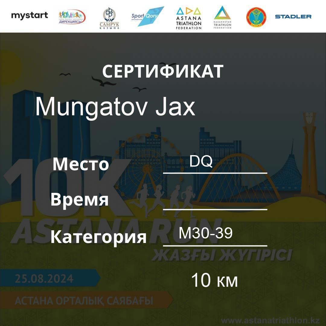 | DQ | Альжанова Миргуль | 477 | F30-39 | 10 км | Download | ||