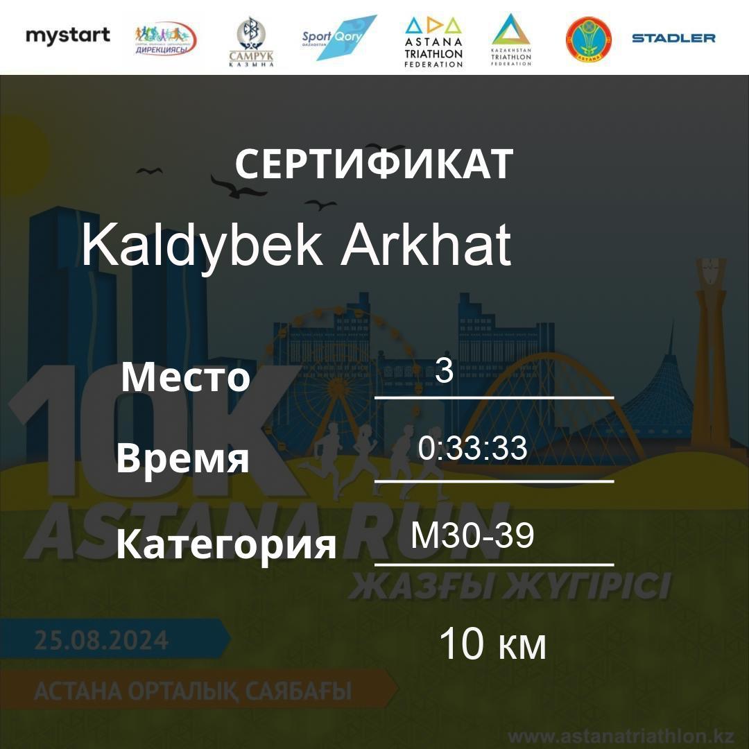 | 33 | Abylkassova Assem | 503 | F30-39 | 10 км | 0:39:01 | 3 | Download |