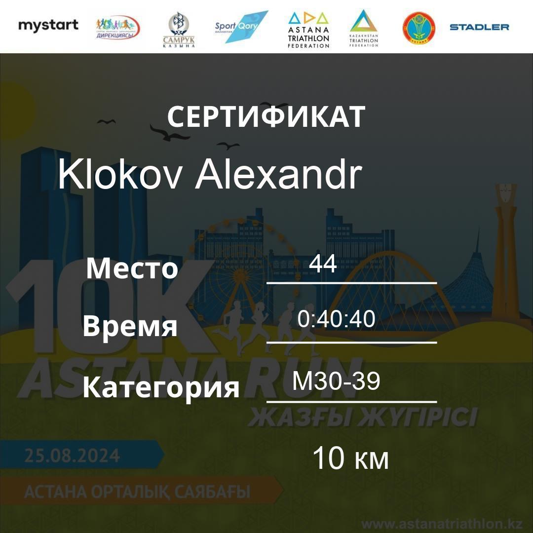 | 160 | Жаксыбаев Айдос | 82 | M40-49 | 10 км | 0:48:57 | 39 | Download |