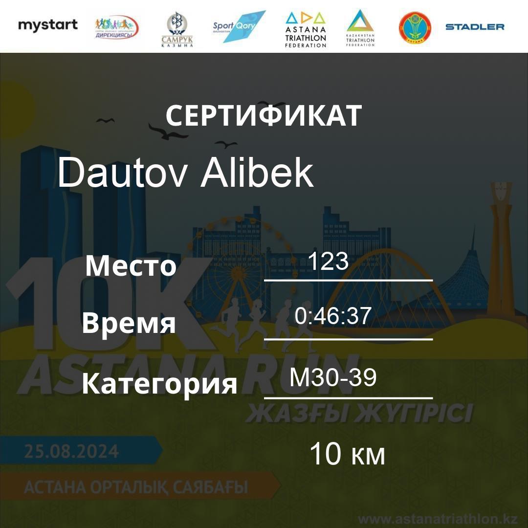| 125 | Kuangaliyev Alnur | 209 | M40-49 | 10 км | 0:46:51 | 35 | Download |