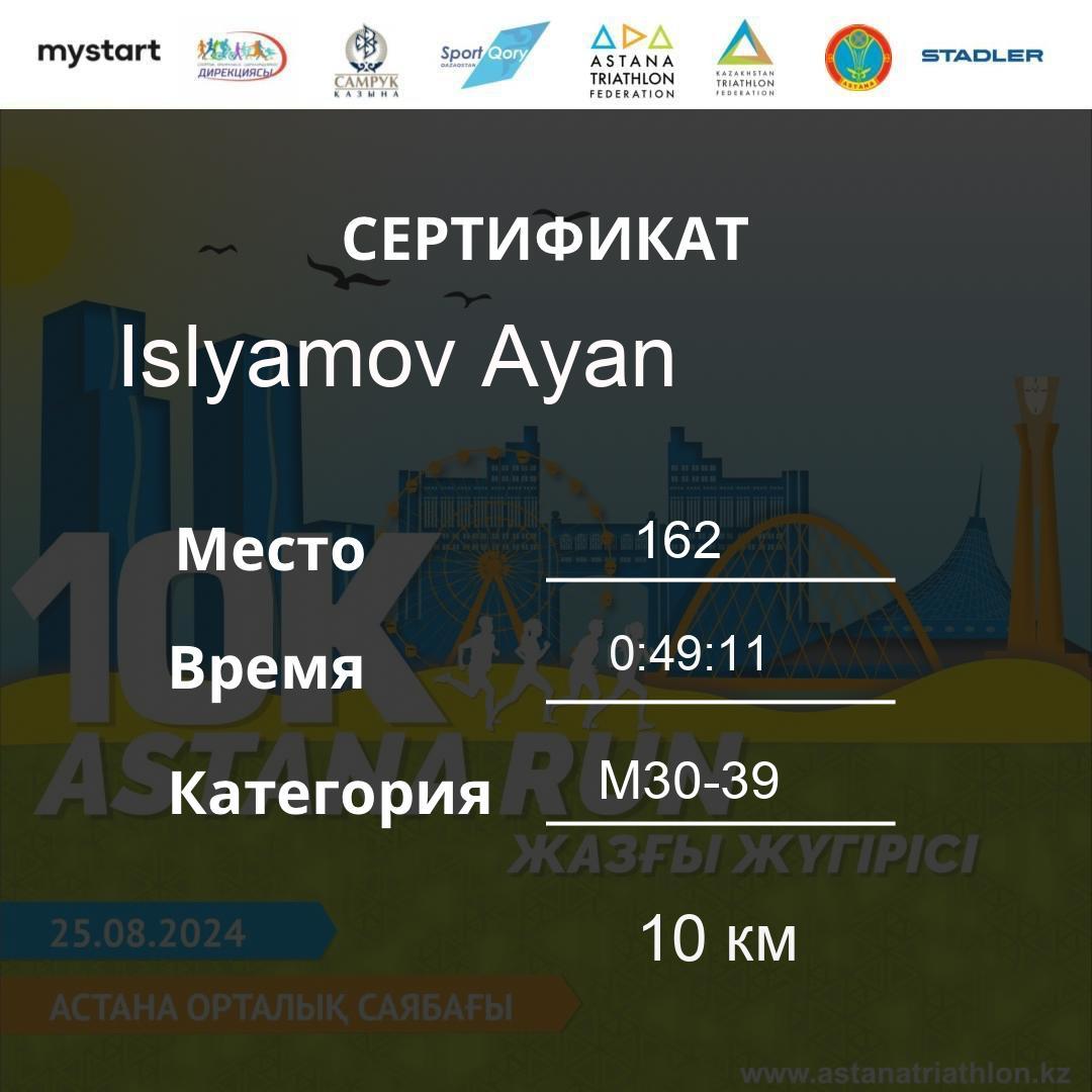 | 182 | Аяпов Руслан | 345 | M40-49 | 10 км | 0:50:48 | 47 | Download |