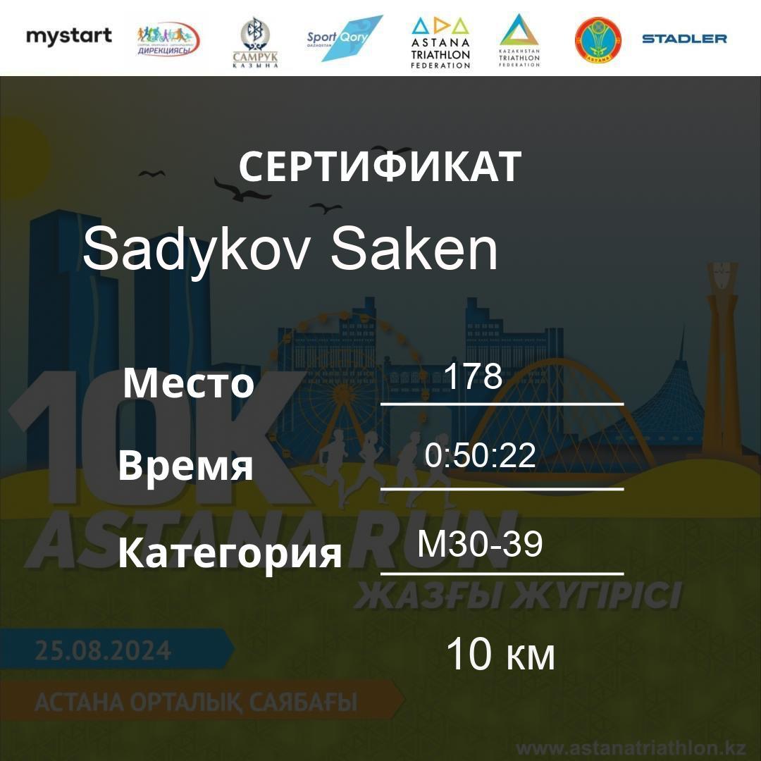 | 177 | Badanov Talgat | 55 | M40-49 | 10 км | 0:50:21 | 45 | Download |