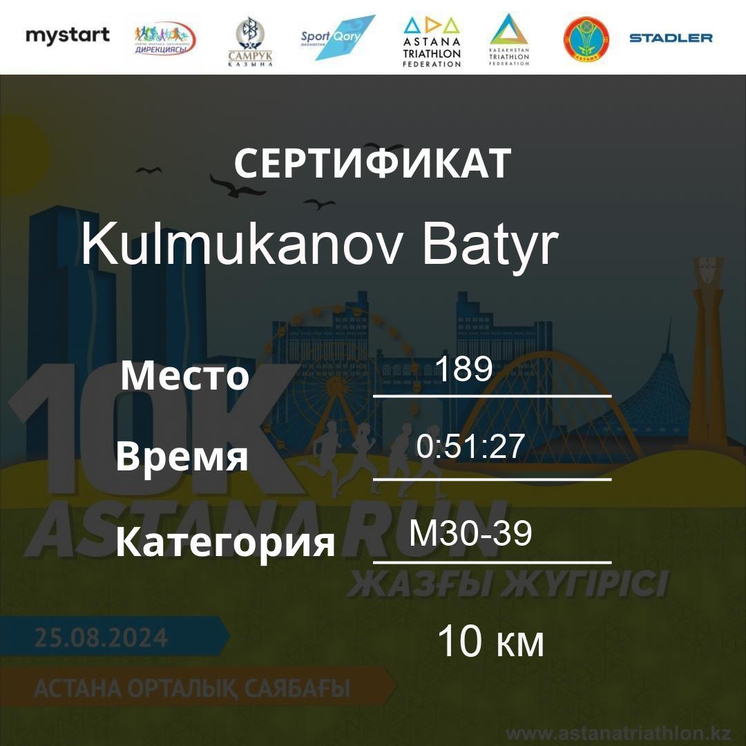 | 187 | Dostiyarov Assylzhan | 123 | M40-49 | 10 км | 0:51:16 | 48 | Download |