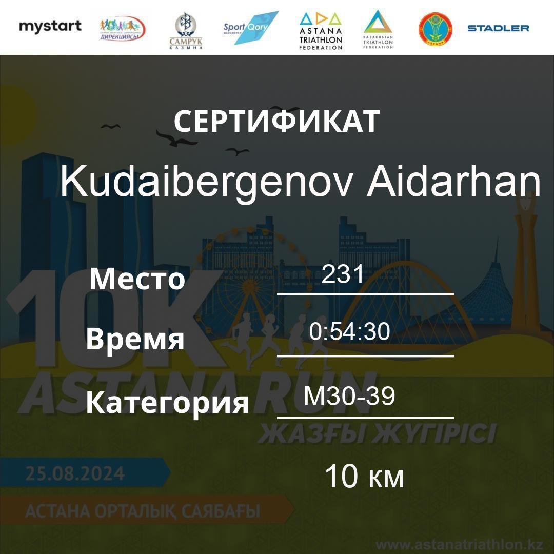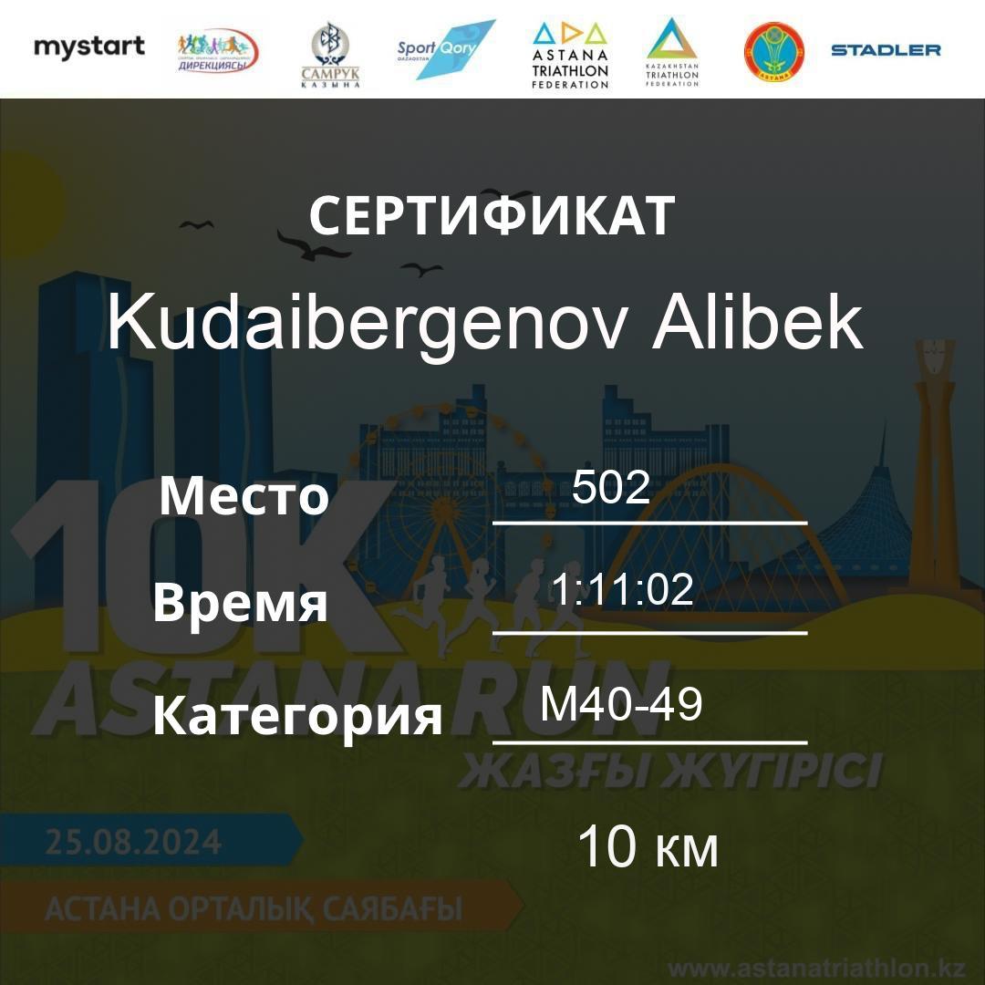 | 502 | Kudaibergenov Alibek | 212 | M40-49 | 10 км | 1:11:02 | 94 | Download |
