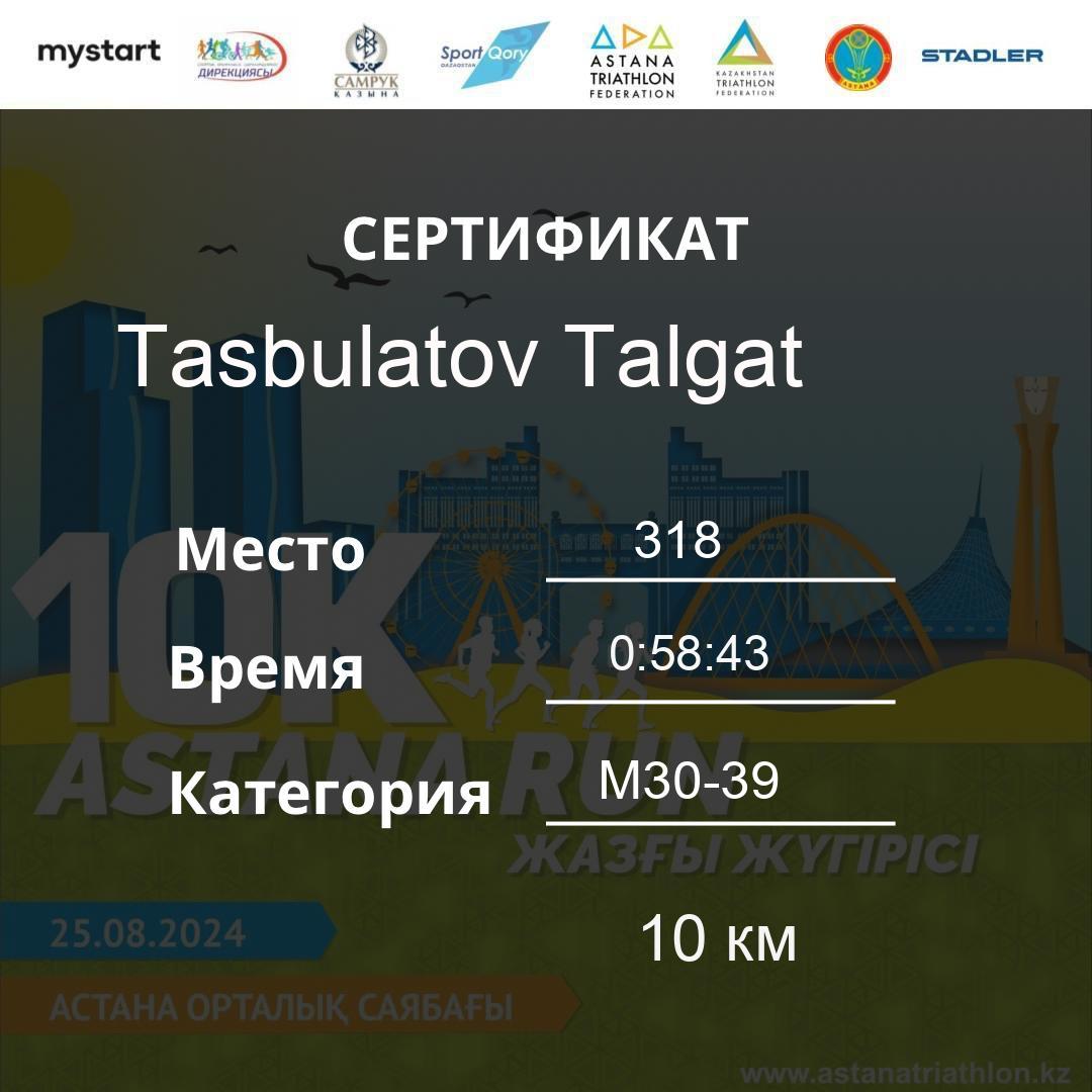 | 335 | Maxot Yessenzhan | 246 | M40-49 | 10 км | 0:59:22 | 71 | Download |