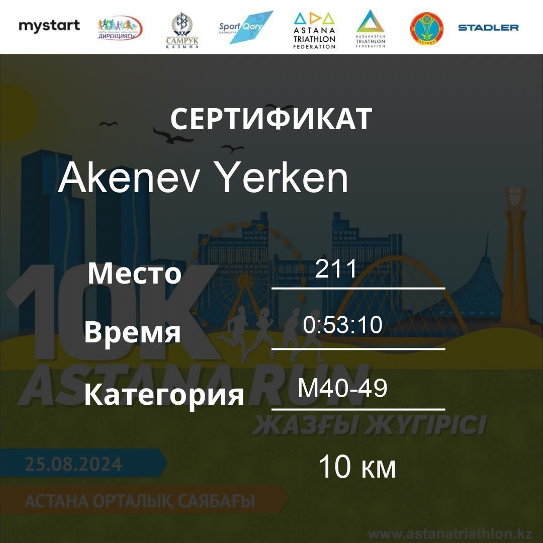 | 211 | Akenev Yerken | 506 | M40-49 | 10 км | 0:53:10 | 51 | Download |