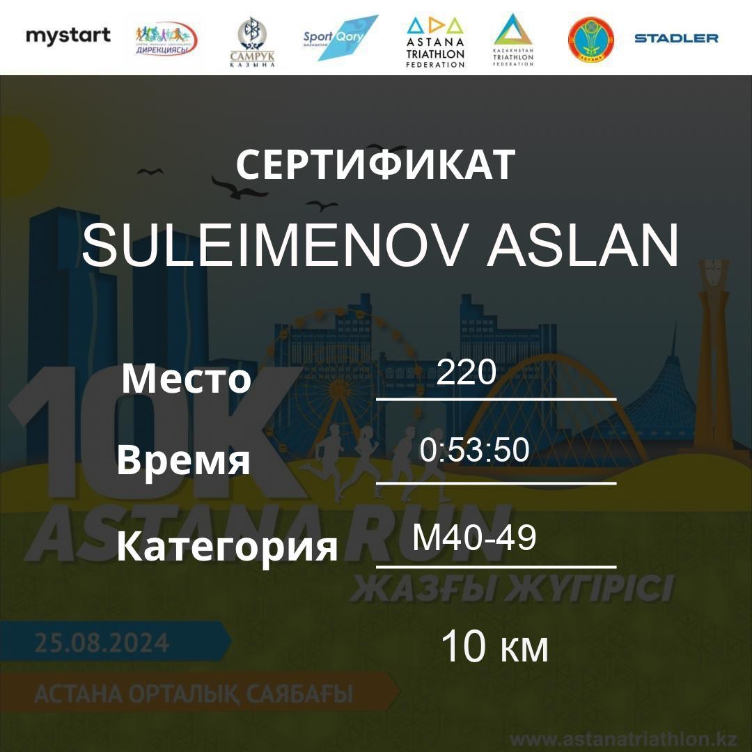 | 220 | SULEIMENOV ASLAN | 376 | M40-49 | 10 км | 0:53:50 | 54 | Download |