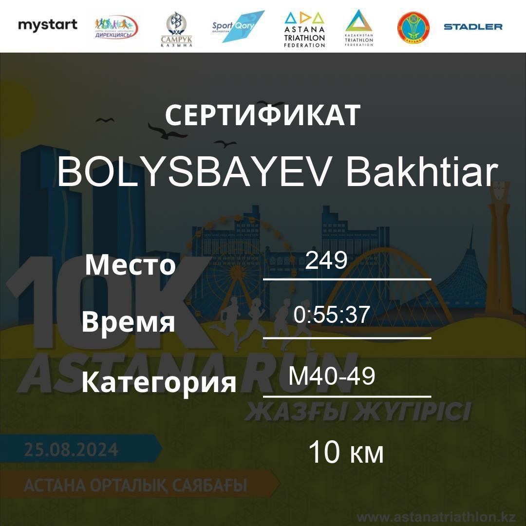 | 249 | BOLYSBAYEV Bakhtiar | 95 | M40-49 | 10 км | 0:55:37 | 58 | Download |