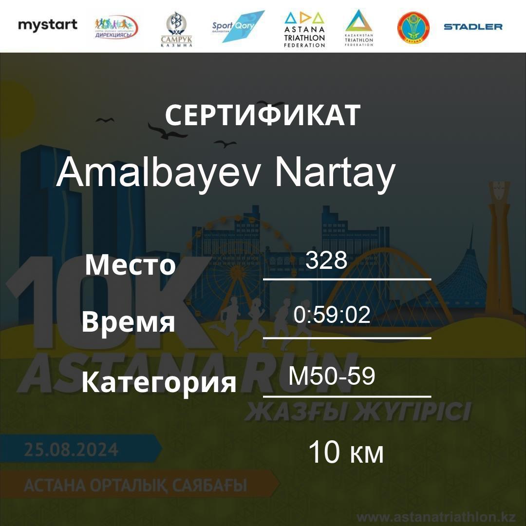 | 328 | Amalbayev Nartay | 34 | M50-59 | 10 км | 0:59:02 | 12 | Download |