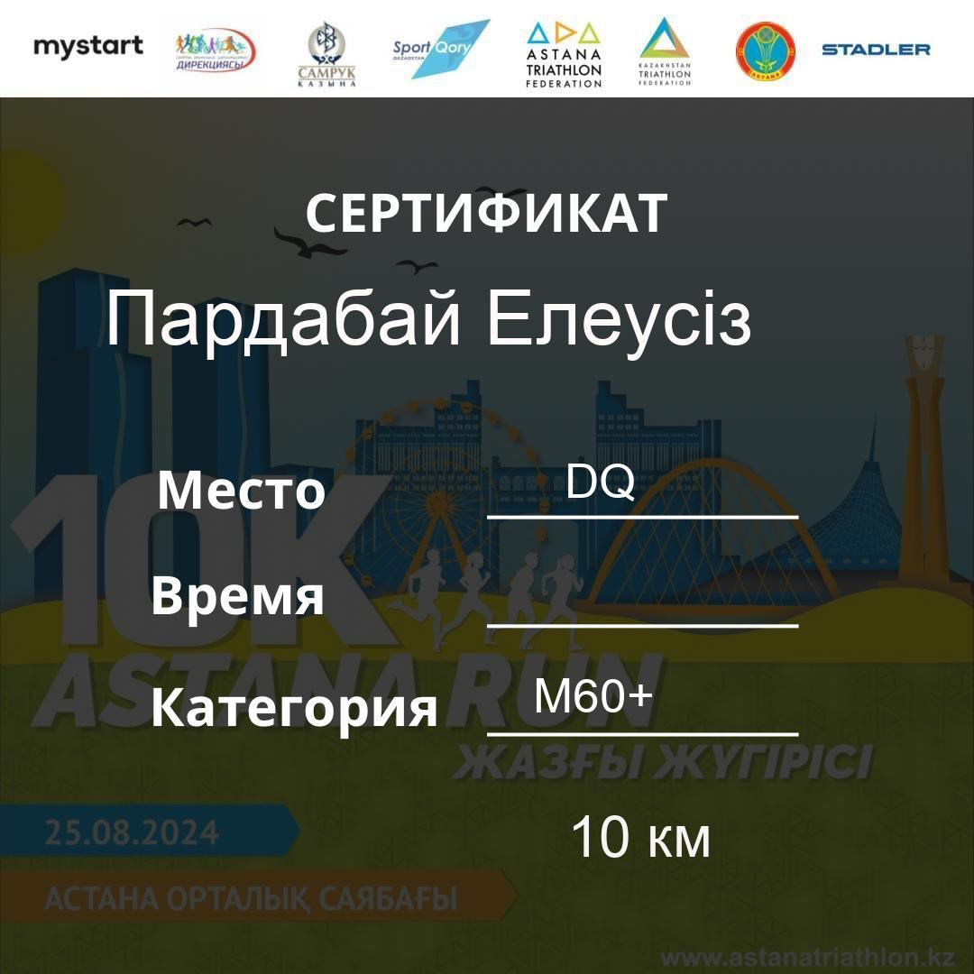 | DQ | Пардабай Елеусіз | 413 | M60+ | 10 км | Download | ||