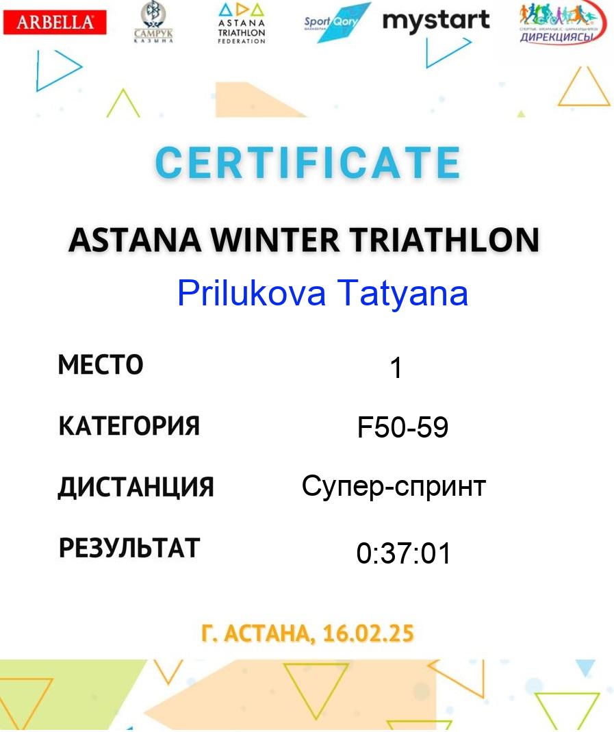 | 2 | Sadykova Nazym | 179 | F30-39 | Супер-спринт | 73 | 0:14:54 | 0:01:09 | 0:10:53 | 0:03:05 | 0:24:14 | 0:54:12 | Download |