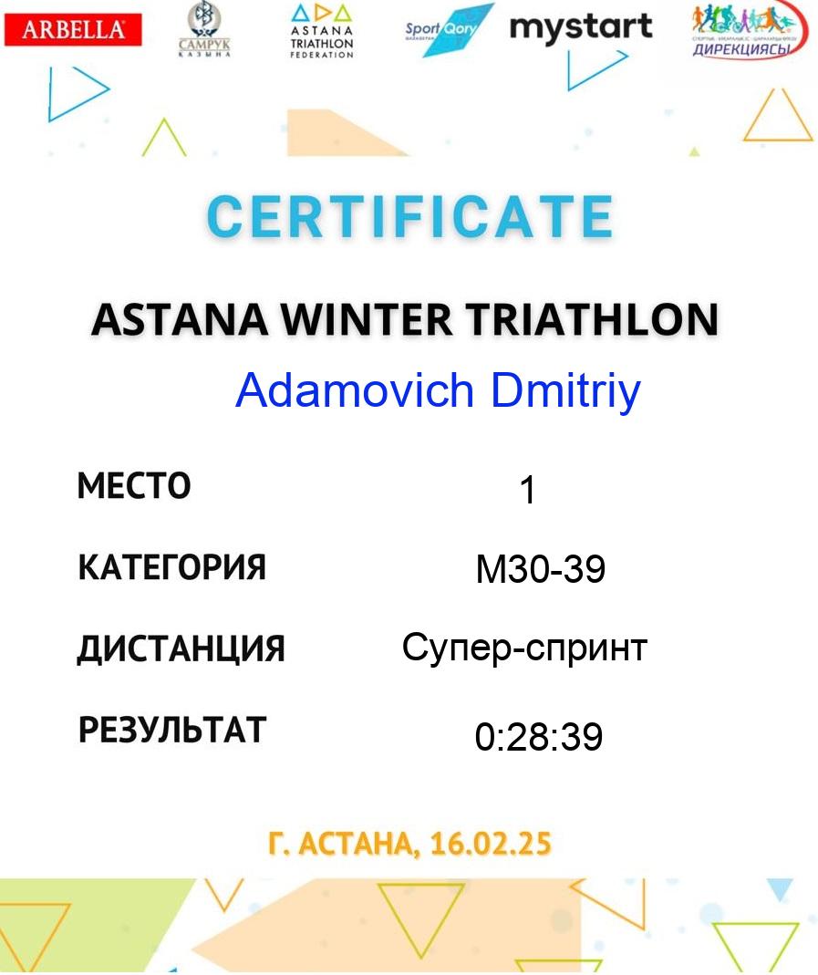 | 3 | Orynbassar Zamanbek | 173 | M18-29 | Супер-спринт | 41 | 0:12:11 | 0:01:25 | 0:12:04 | 0:02:18 | 0:11:53 | 0:39:51 | Download |