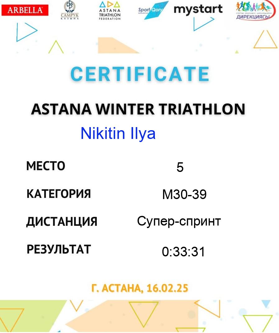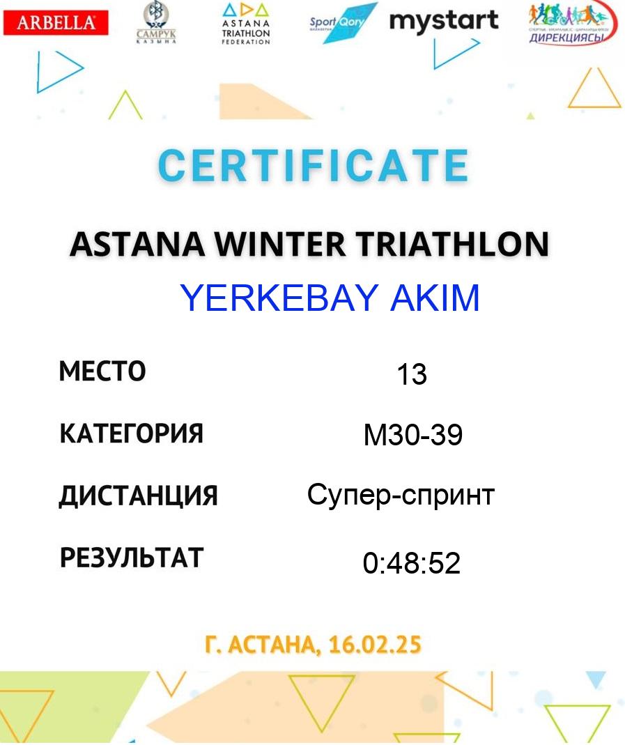 | 5 | MYZAMBAY AIBERGEN | 170 | M18-29 | Супер-спринт | 48 | 0:11:09 | 0:01:15 | 0:08:34 | 0:01:38 | 0:18:49 | 0:41:23 | Download |
