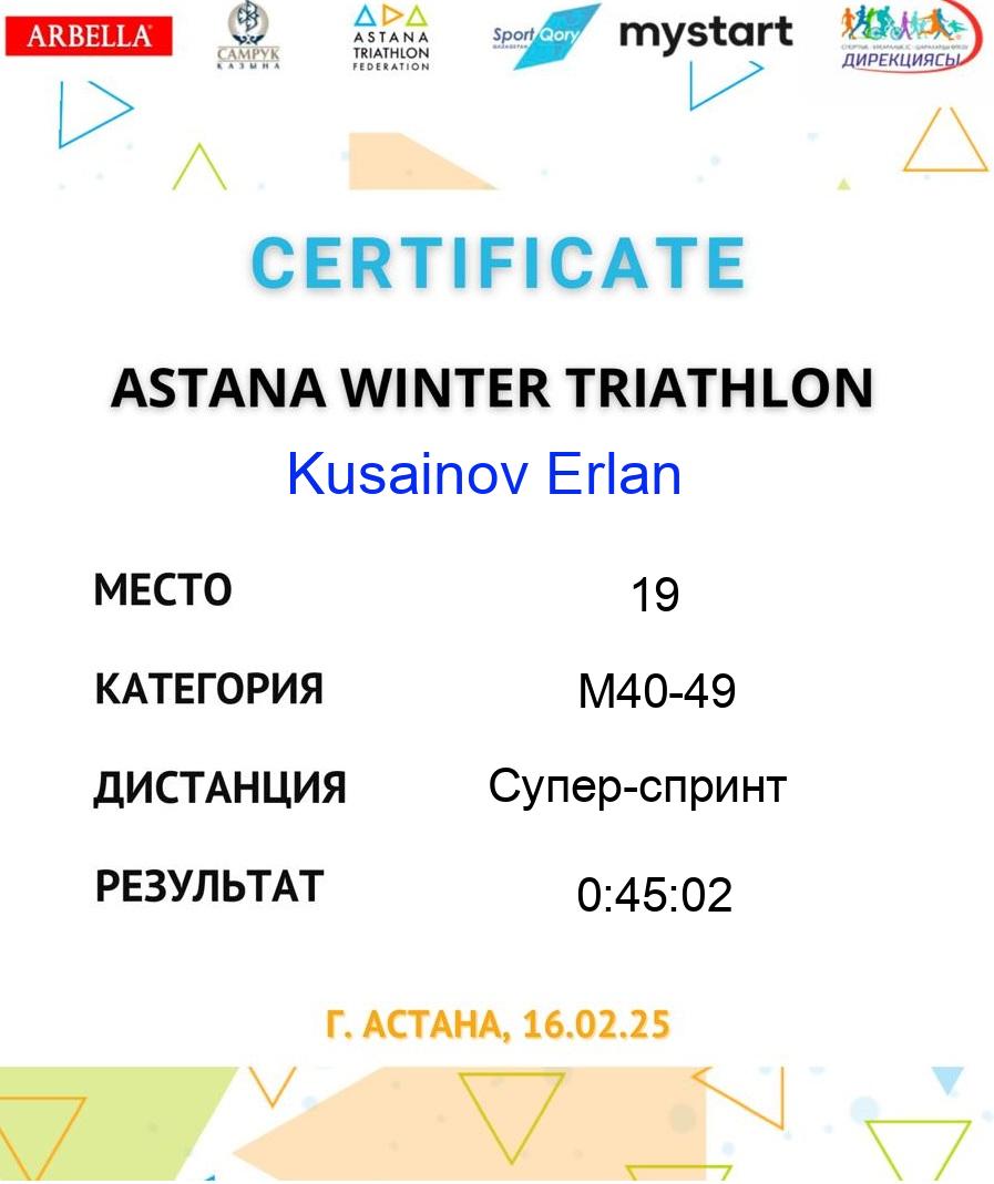 | 19 | Kusainov Erlan | 157 | M40-49 | Супер-спринт | 60 | 0:12:10 | 0:01:17 | 0:10:13 | 0:02:39 | 0:18:46 | 0:45:02 | Download |