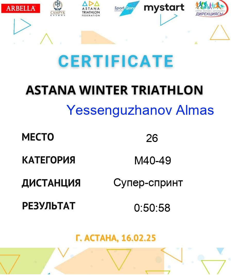 | 26 | Yessenguzhanov Almas | 206 | M40-49 | Супер-спринт | 70 | 0:15:21 | 0:01:20 | 0:16:14 | 0:02:35 | 0:15:31 | 0:50:58 | Download |