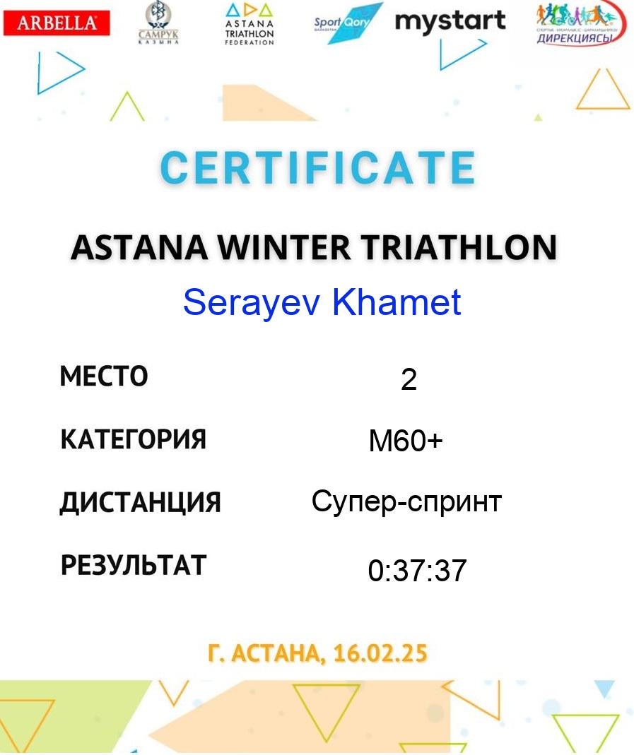 | 2 | Serayev Khamet | 181 | M60+ | Супер-спринт | 36 | 0:12:30 | 0:01:04 | 0:09:43 | 0:02:12 | 0:12:10 | 0:37:37 | Download |