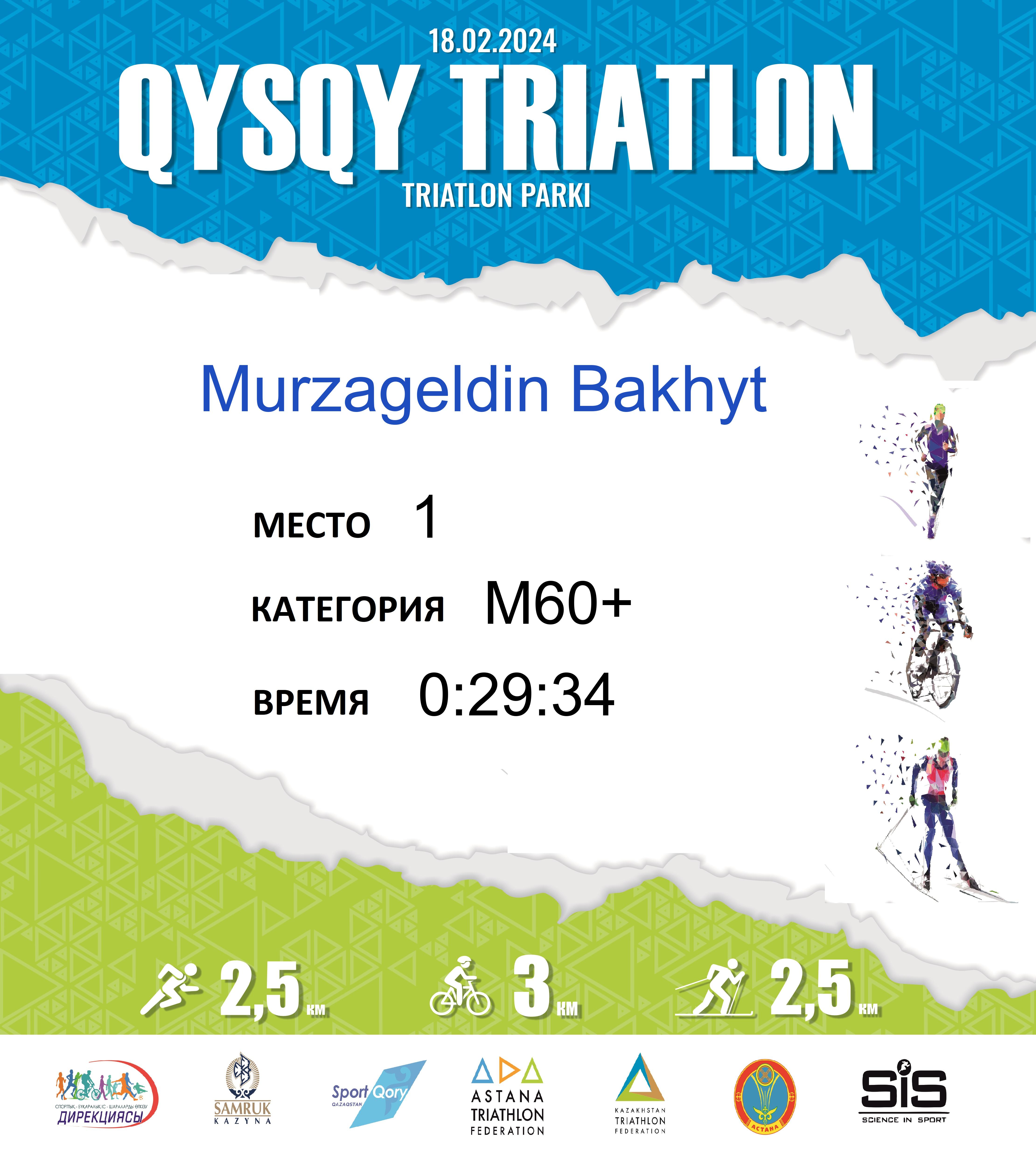| 1 | Murzageldin Bakhyt | 147 | M60+ | 14 | 0:29:34 | Download | |
