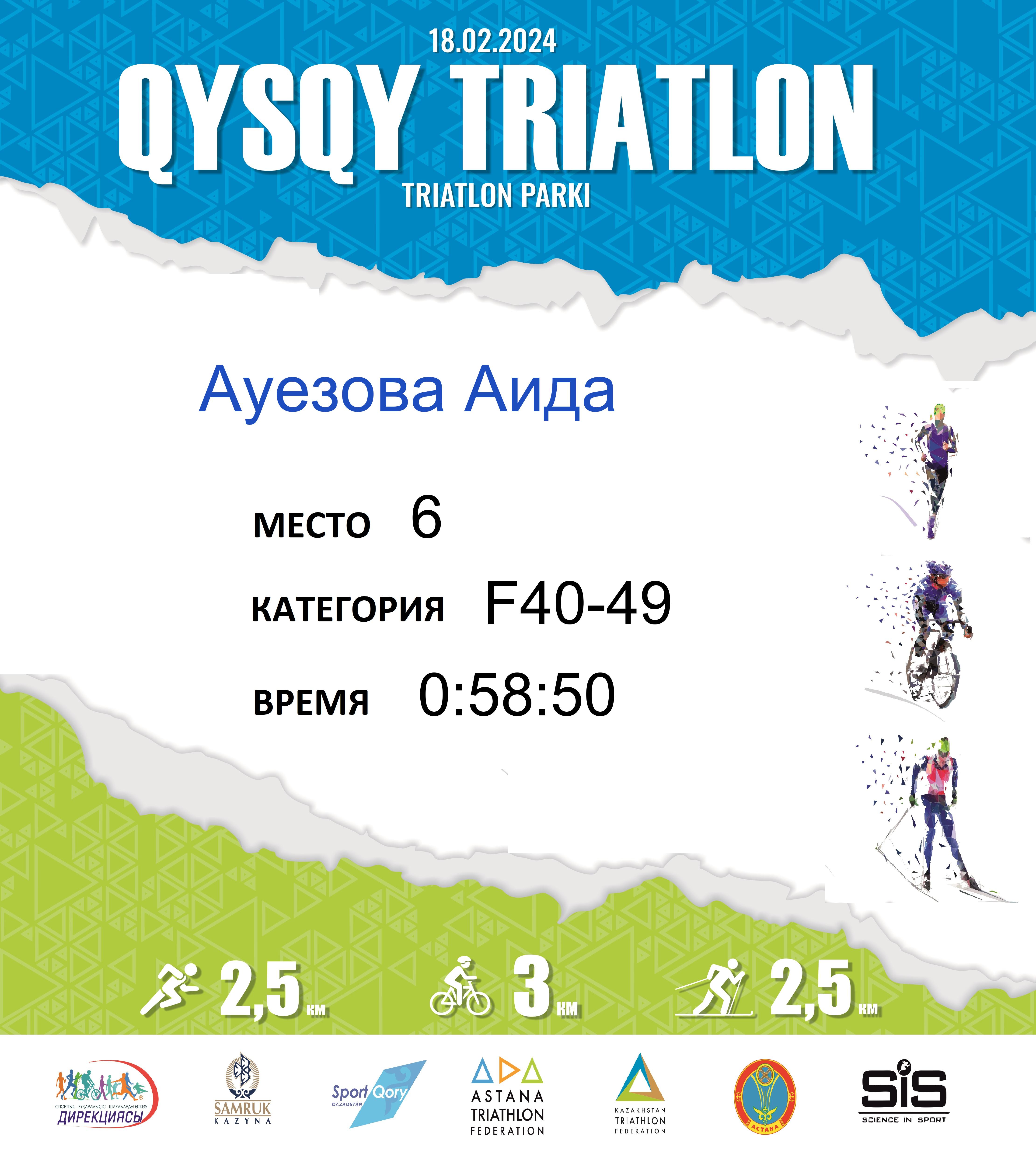 | 6 | Ауезова Аида | 216 | F40-49 | 72 | 0:58:50 | Download | |
