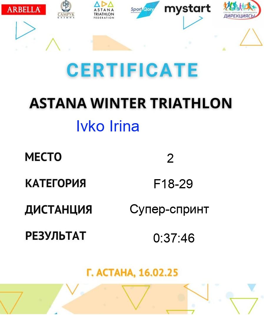 | 2 | Talap Ulpan | 215 | F40-49 | Супер-спринт | 52 | 0:13:42 | 0:01:05 | 0:11:00 | 0:02:17 | 0:14:35 | 0:42:37 | Жүктеу |