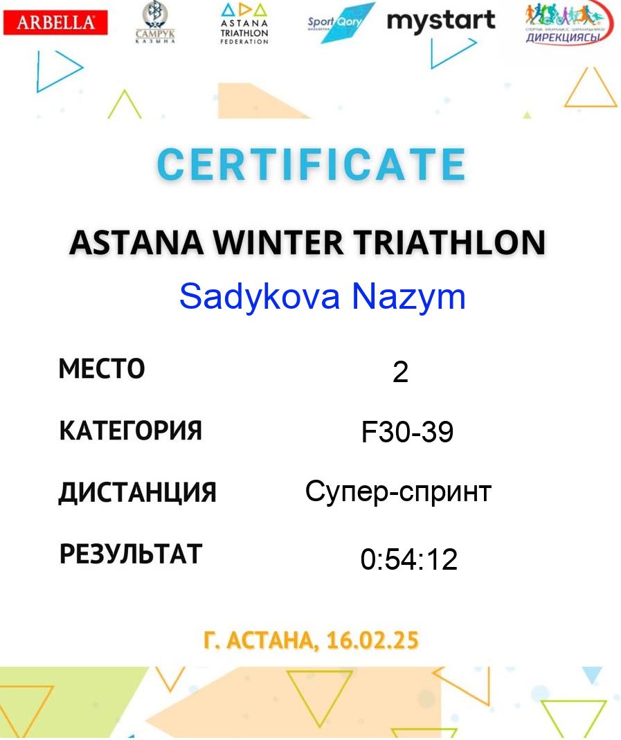 | 2 | Sadykova Nazym | 179 | F30-39 | Супер-спринт | 73 | 0:14:54 | 0:01:09 | 0:10:53 | 0:03:05 | 0:24:14 | 0:54:12 | Жүктеу |
