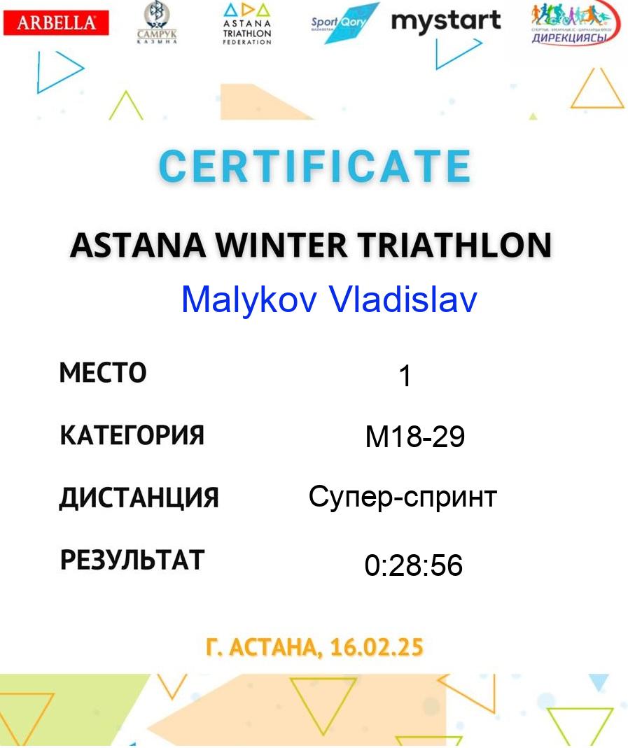 | 1 | Malykov Vladislav | 160 | M18-29 | Супер-спринт | 7 | 0:09:57 | 0:00:51 | 0:07:36 | 0:01:51 | 0:08:43 | 0:28:56 | Жүктеу |