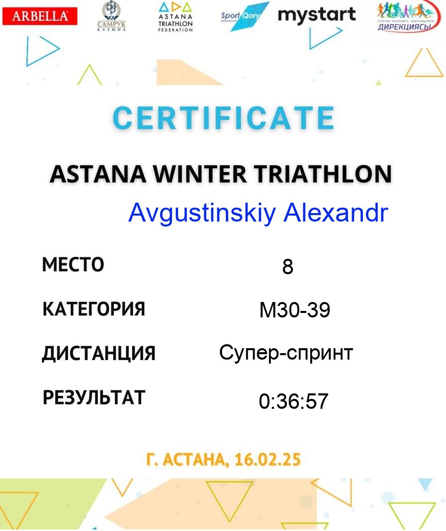 | 8 | Avgustinskiy Alexandr | 121 | M30-39 | Супер-спринт | 31 | 0:11:54 | 0:01:01 | 0:08:44 | 0:01:49 | 0:13:32 | 0:36:57 | Жүктеу |
