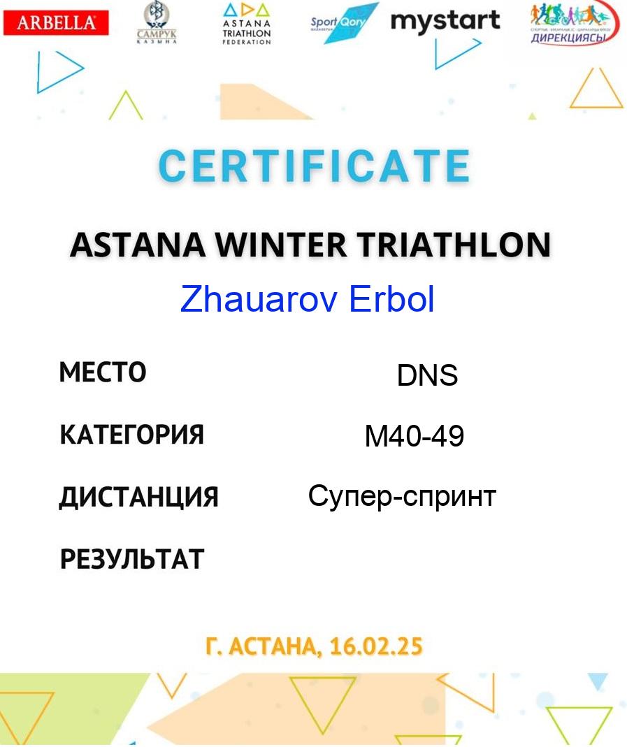 | 22 | Seilev Dauren | 180 | M40-49 | Супер-спринт | 64 | 0:12:41 | 0:01:16 | 0:10:50 | 0:03:01 | 0:19:14 | 0:47:00 | Жүктеу |