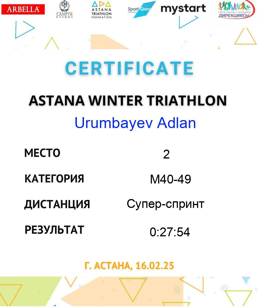 | 2 | Urumbayev Adlan | 193 | M40-49 | Супер-спринт | 2 | 0:09:01 | 0:00:51 | 0:07:58 | 0:01:23 | 0:08:42 | 0:27:54 | Жүктеу |