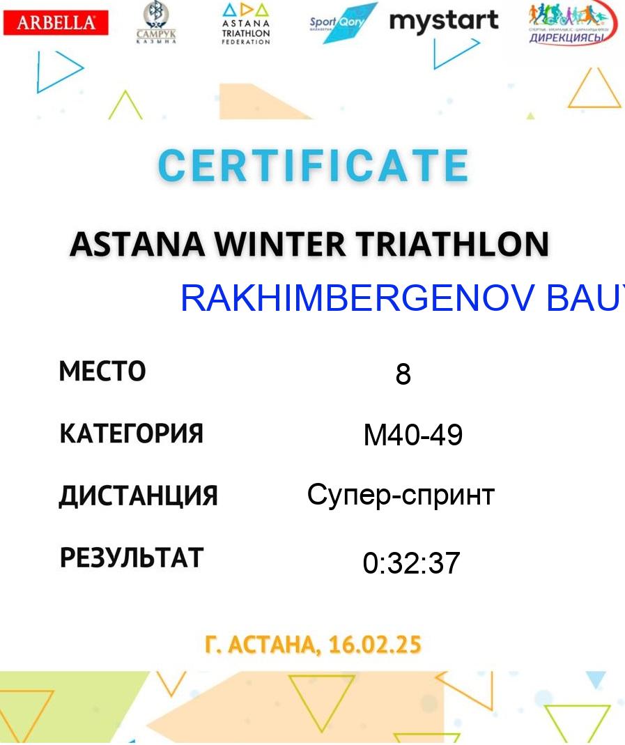 | 8 | RAKHIMBERGENOV BAUYRZHAN | 178 | M40-49 | Супер-спринт | 18 | 0:10:08 | 0:00:56 | 0:09:09 | 0:01:58 | 0:10:27 | 0:32:37 | Жүктеу |