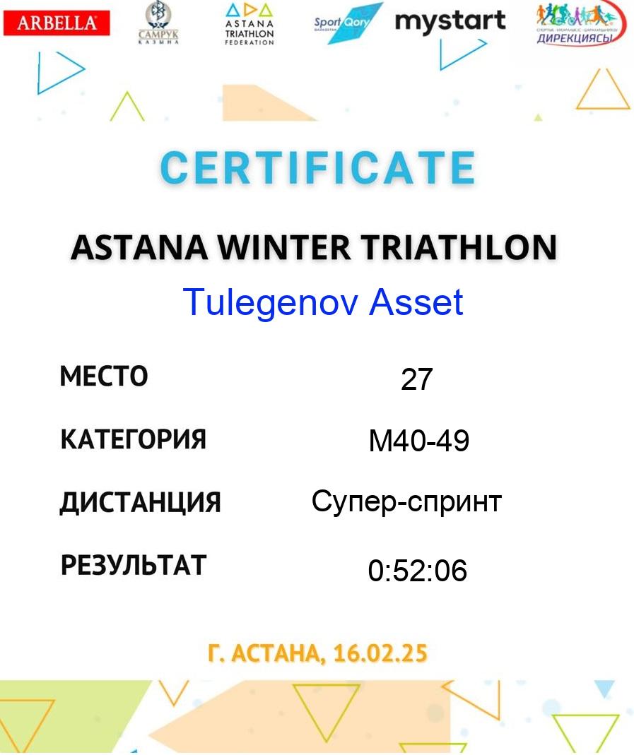 | 27 | Tulegenov Asset | 192 | M40-49 | Супер-спринт | 72 | 0:13:47 | 0:01:24 | 0:11:10 | 0:04:42 | 0:21:06 | 0:52:06 | Жүктеу |