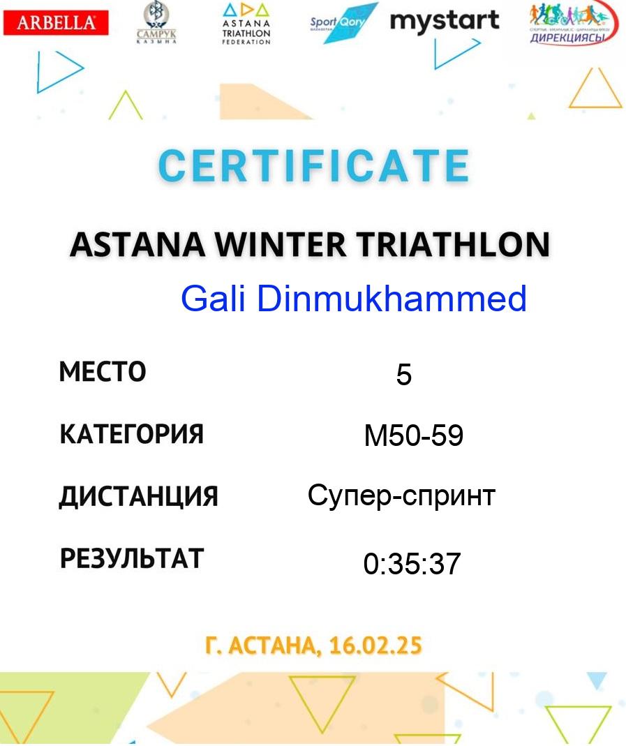 | 5 | Gali Dinmukhammed | 133 | M50-59 | Супер-спринт | 28 | 0:10:44 | 0:01:31 | 0:09:03 | 0:02:02 | 0:12:19 | 0:35:37 | Жүктеу |