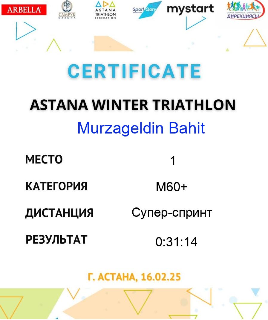 | 1 | Murzageldin Bahit | 168 | M60+ | Супер-спринт | 12 | 0:10:46 | 0:00:52 | 0:08:52 | 0:01:45 | 0:09:00 | 0:31:14 | Жүктеу |