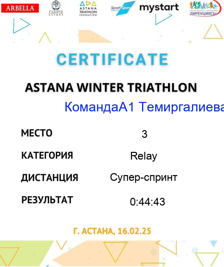 | 3 | КомандаА1 Темиргалиева Д.,Касымбекова А.,Халелов С. | 221 | Relay | Супер-спринт | 58 | 0:16:09 | 0:01:35 | 0:12:24 | 0:01:40 | 0:12:58 | 0:44:43 | Жүктеу |