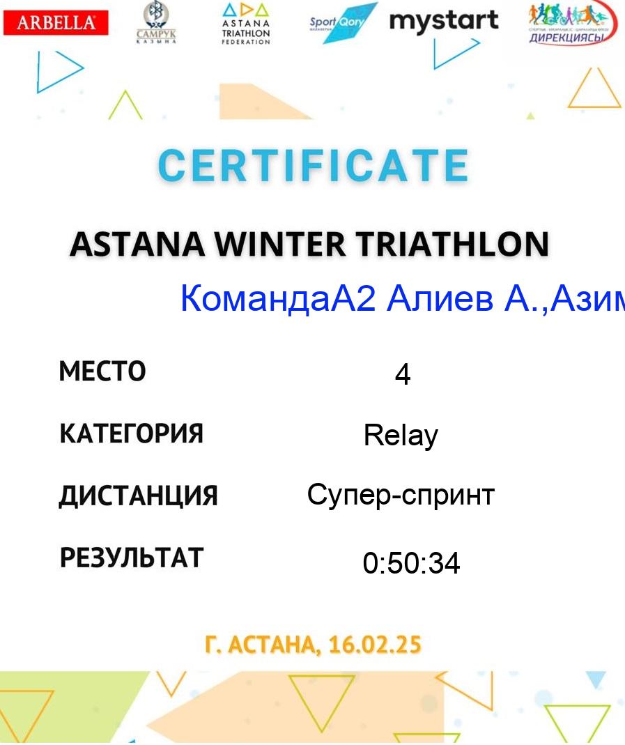 | 4 | КомандаА2 Алиев А.,Азимжанов Р.,Алибеков Ж. | 222 | Relay | Супер-спринт | 68 | 0:12:22 | 0:01:55 | 0:11:14 | 0:01:12 | 0:23:54 | 0:50:34 | Жүктеу |
