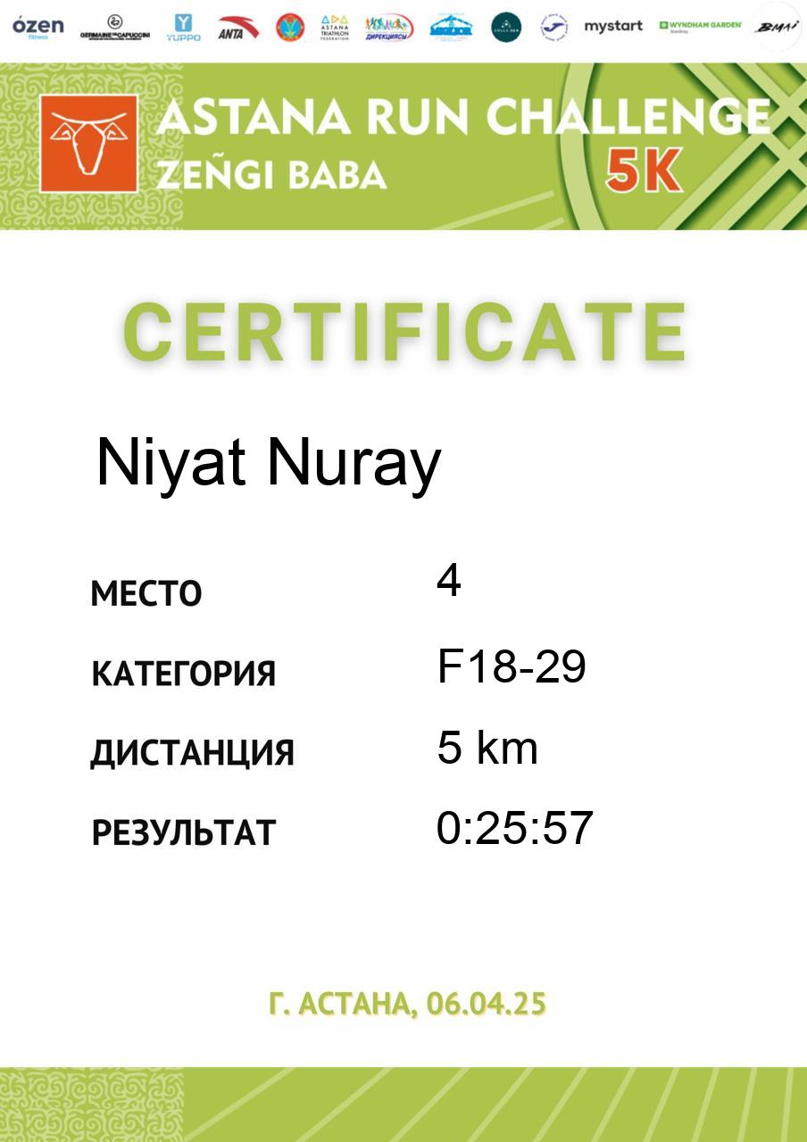 | 4 | Niyat Nuray | 529 | F18-29 | 5 km | 0:25:57 | 266 | Жүктеу |
