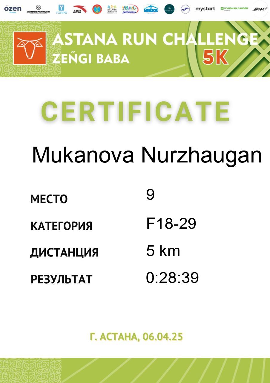 | 9 | Mukanova Nurzhaugan | 489 | F18-29 | 5 km | 0:28:39 | 395 | Жүктеу |