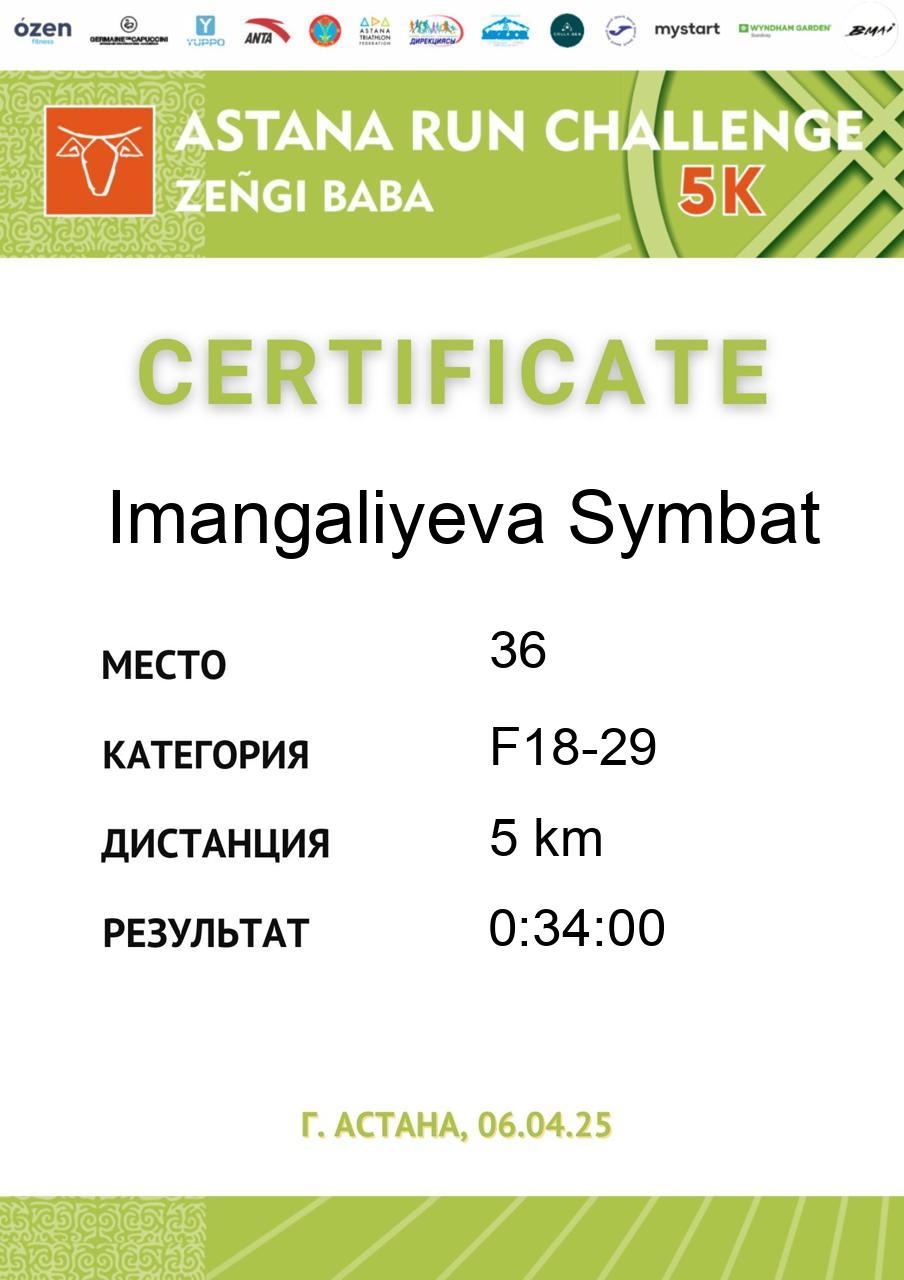 | 36 | Imangaliyeva Symbat | 283 | F18-29 | 5 km | 0:34:00 | 628 | Жүктеу |