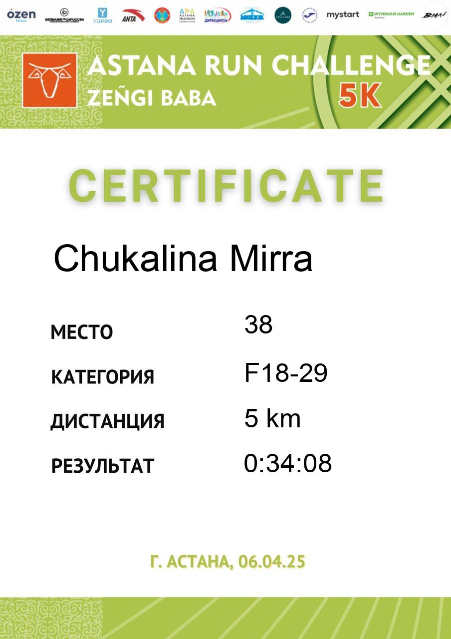 | 38 | Chukalina Mirra | 206 | F18-29 | 5 km | 0:34:08 | 636 | Жүктеу |