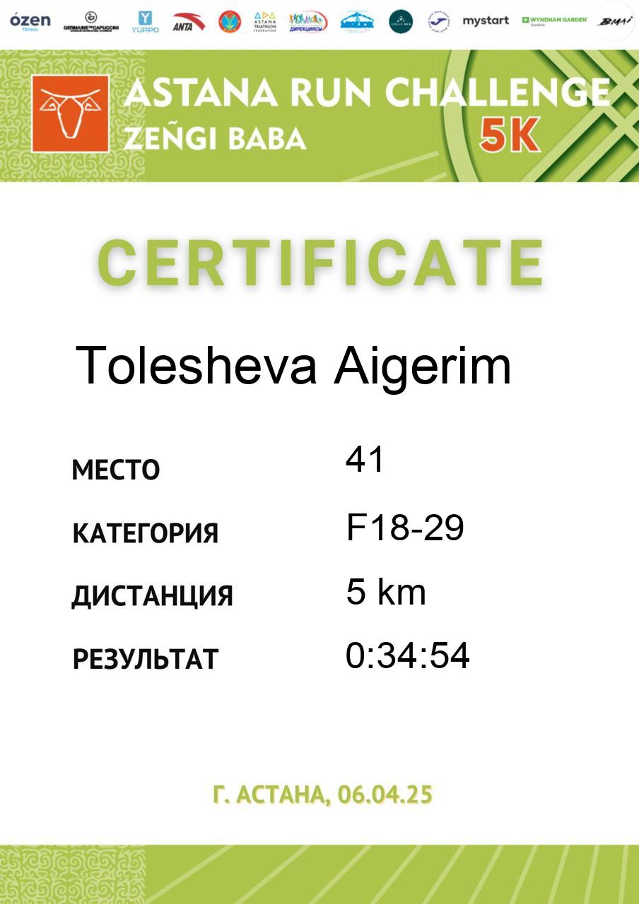 | 41 | Tolesheva Aigerim | 706 | F18-29 | 5 km | 0:34:54 | 666 | Жүктеу |